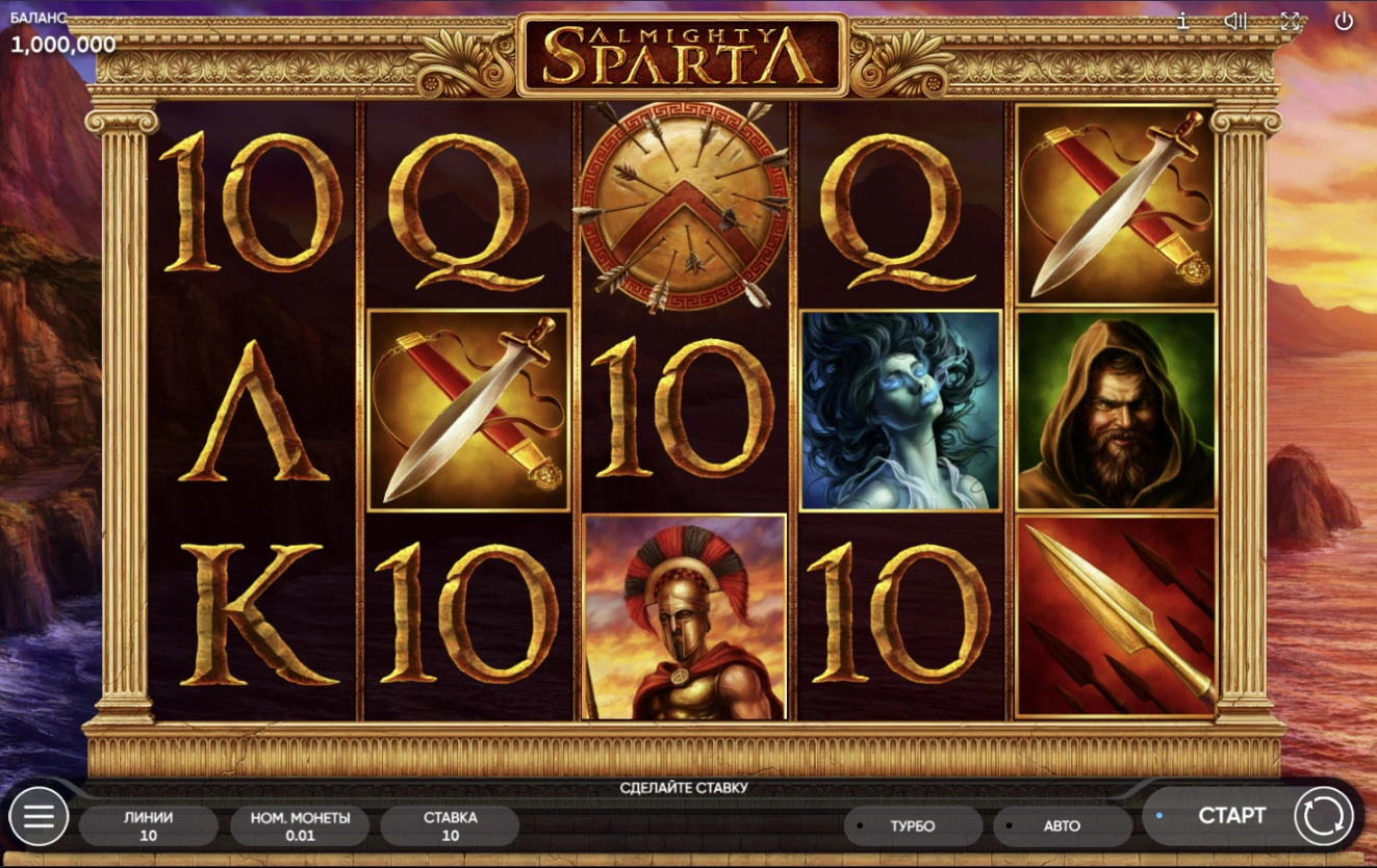 В нашей истории очень мало событий, которые так часто фигурировали в рассказах, легендах, книгах, фильмах, компьютерных играх и, да, в игровых автоматах. Драма о судьбах бесстрашных спартанцев превращается в напряженные битвы. Almighty Sparta — это вариант от Endorphina, в котором представлены высокие дикие символы Леонидаса, персидский царь Ксеркс и раунд бесплатных вращений с множителем x4, который может привести к выигрышам, превышающим вашу ставку до 5000 раз.