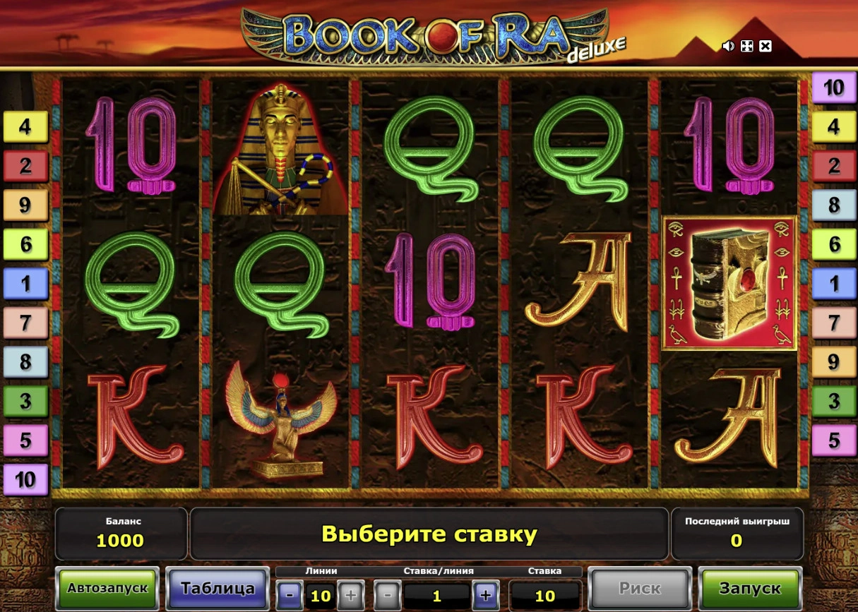 Book of Ra Deluxe — видео-слот с пятью барабанами, тремя рядами и 10 переменными линиями выплат. Выигрыши присуждаются от двух до пяти совпадающих символов в строке только слева направо. Ваша экспедиция в древние катакомбы, может быть доступна на настольном компьютере или мобильном с RTP 95,10%.