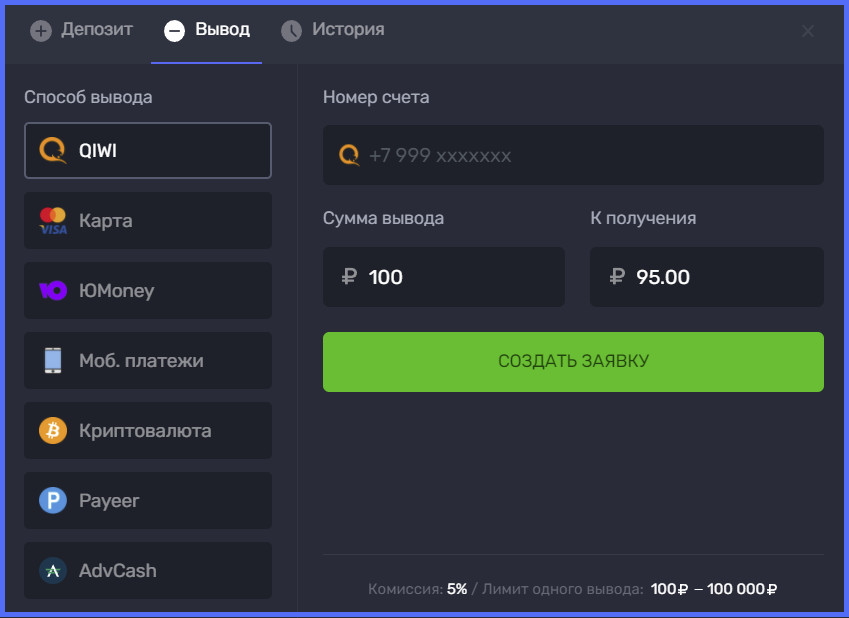 | Qiwi | 100 рублей – 15000 рублей | Зачисление сразу | 100 рублей – 100000 рублей | До 3 рабочих дней | 5% |
